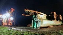 04:07A semi-trailer headlong down a bank.